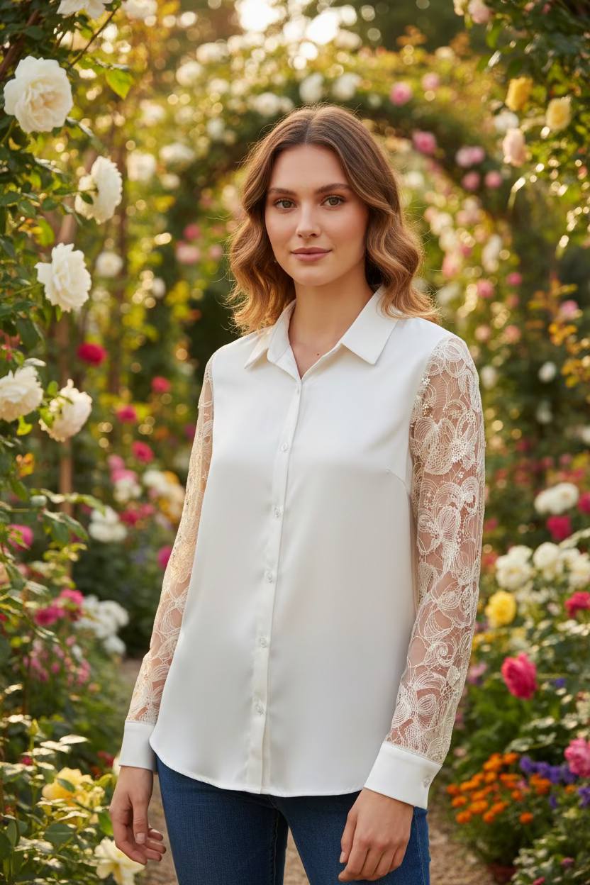 Camicia effetto raso seta luminosa ed elegante, impreziosita da maniche trasparenti ricamate e decorate con paillettes. Un capo raffinato che dona luce e femminilità ad ogni outfit. Vestibilità 120cm di giroseno