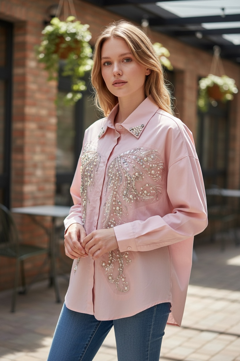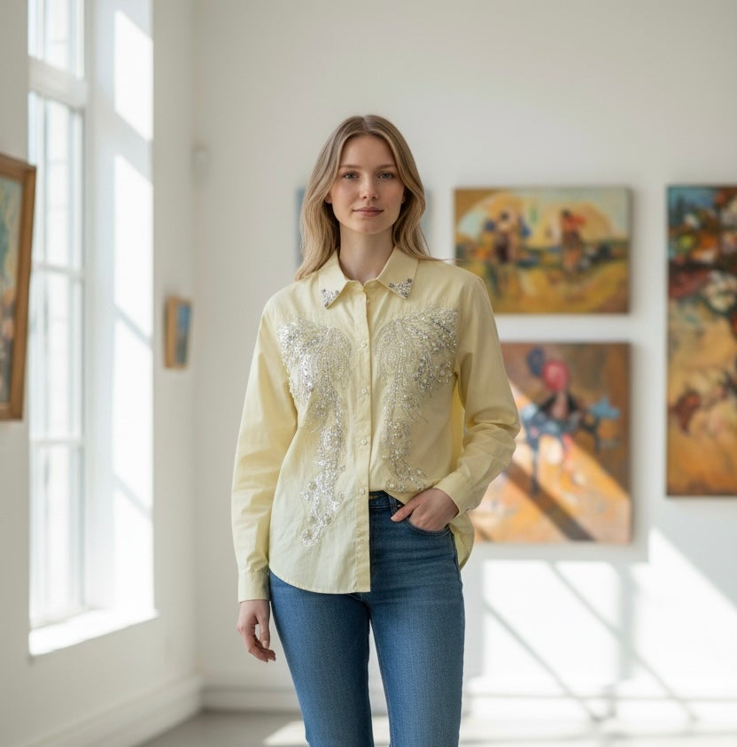 Camicia in cotone con applicazione strass sul colletto e sul fondo, 120cm di circonferenza seno