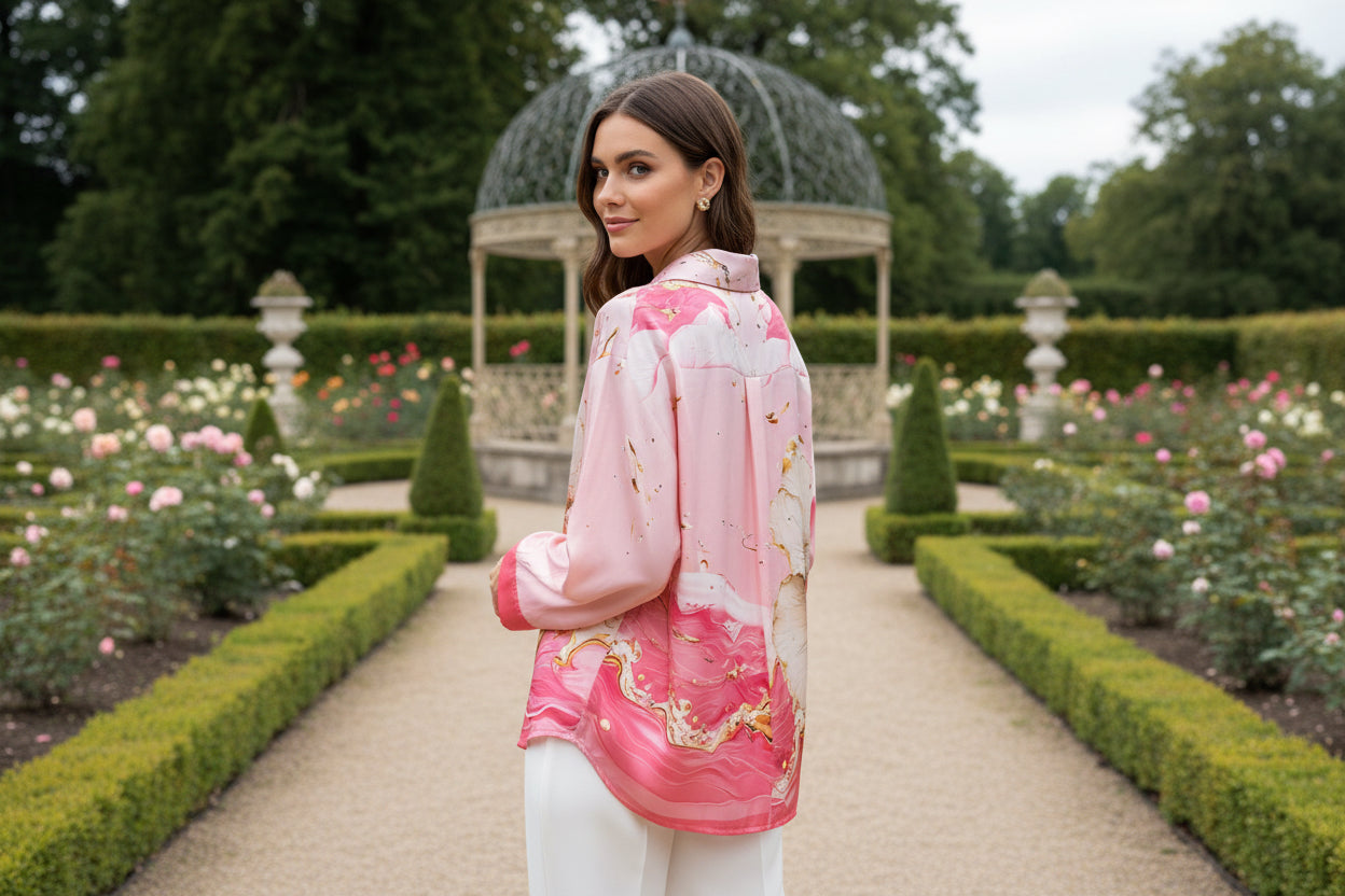 Camicia effetto raso seta, dal taglio asimmetrico (più corta davanti e più lunga dietro). Manica morbida e delicato sfiocco sulla schiena per un tocco elegante e femminile vestibilità fino a 160cm di giroseno