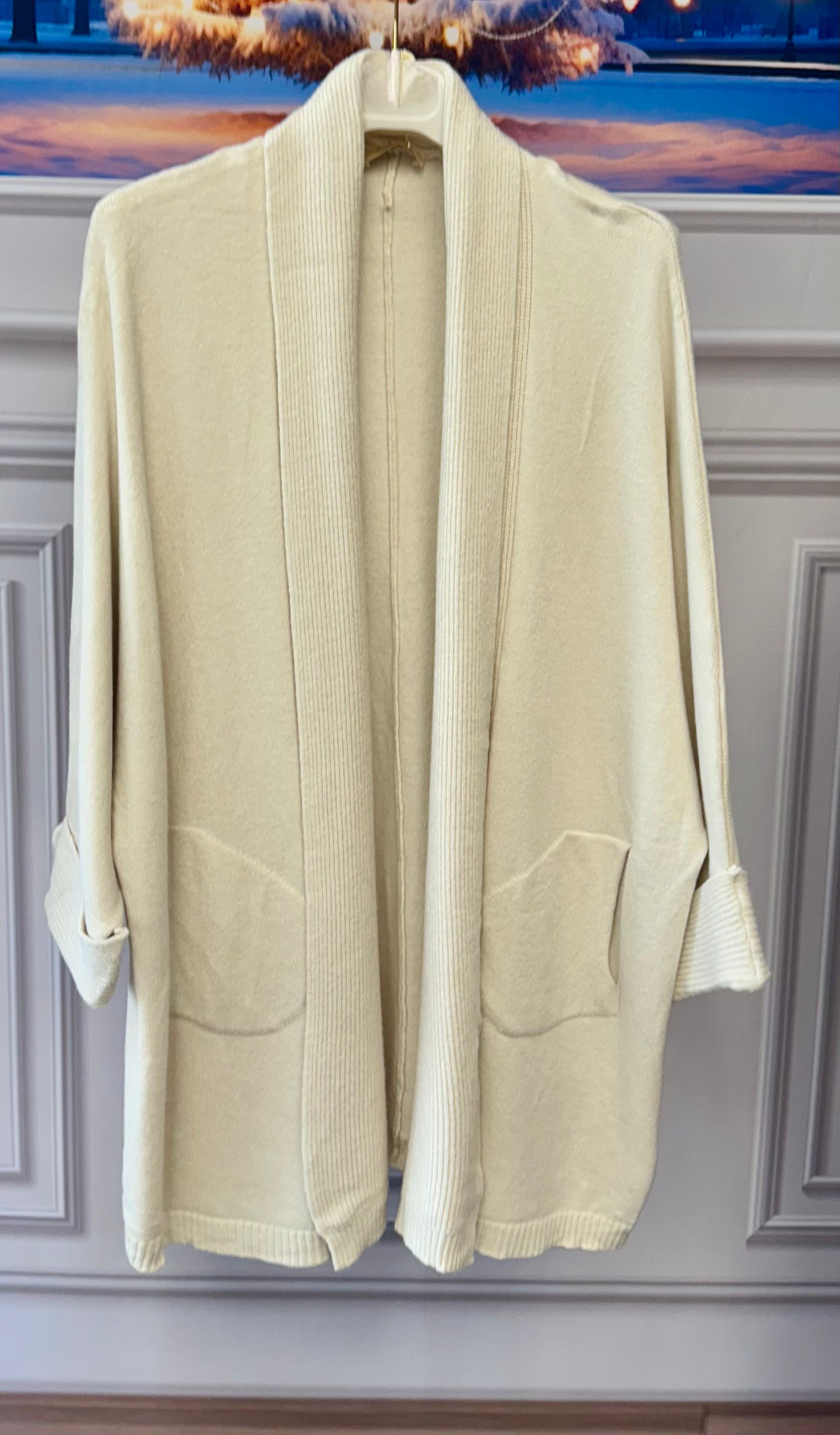Cardigan oversize in lana pettinata con tasche e manica risvoltato con bottone in tinta