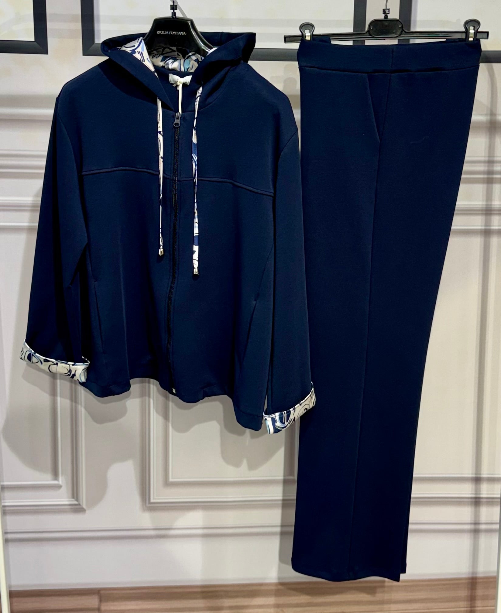 Coordinato tessuto nuvola con felpa con zip lungo tutta la lunghezza ,tasche e cappuccio regolabile . Pantaloni con tasche e elastico in vita