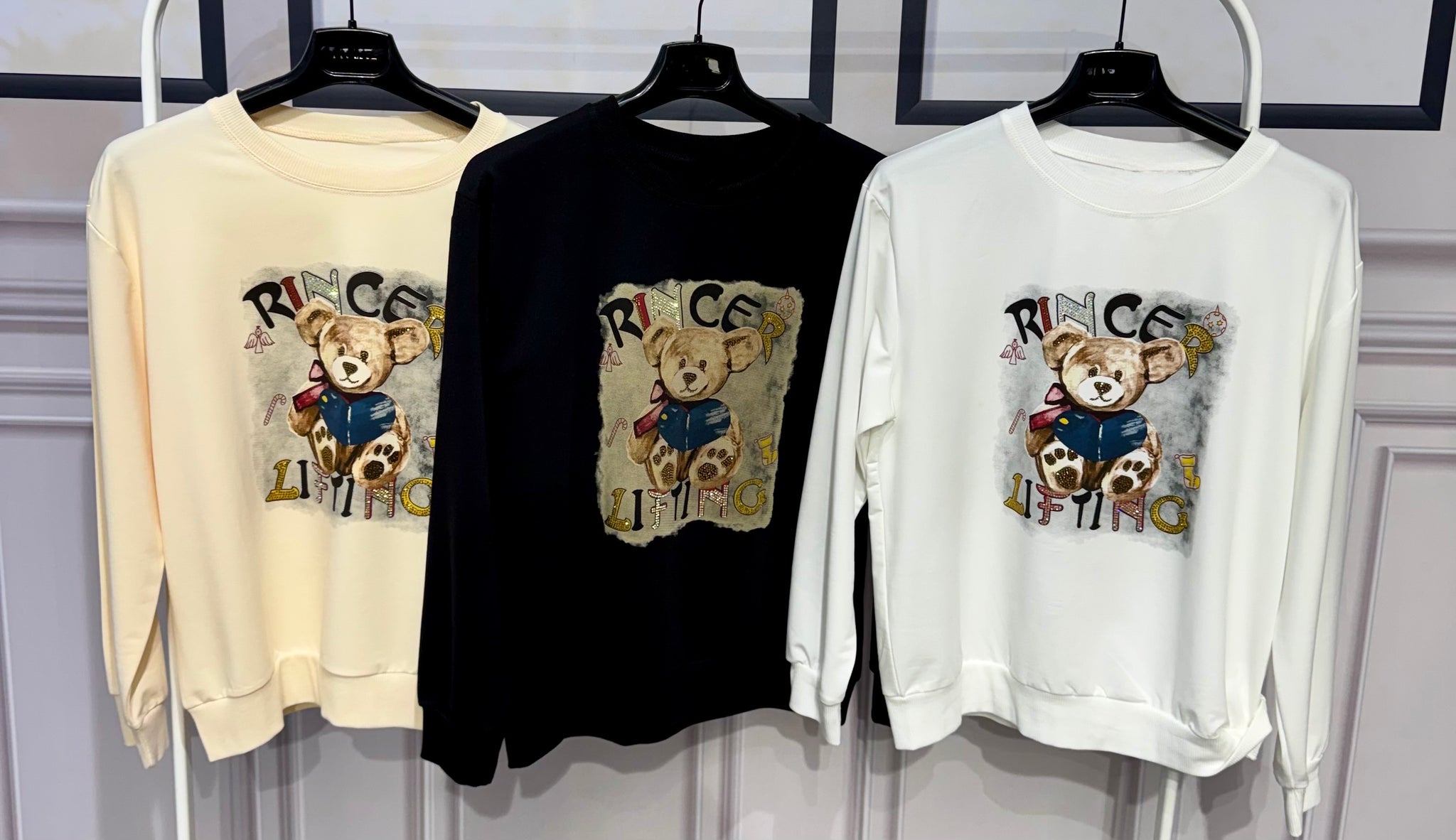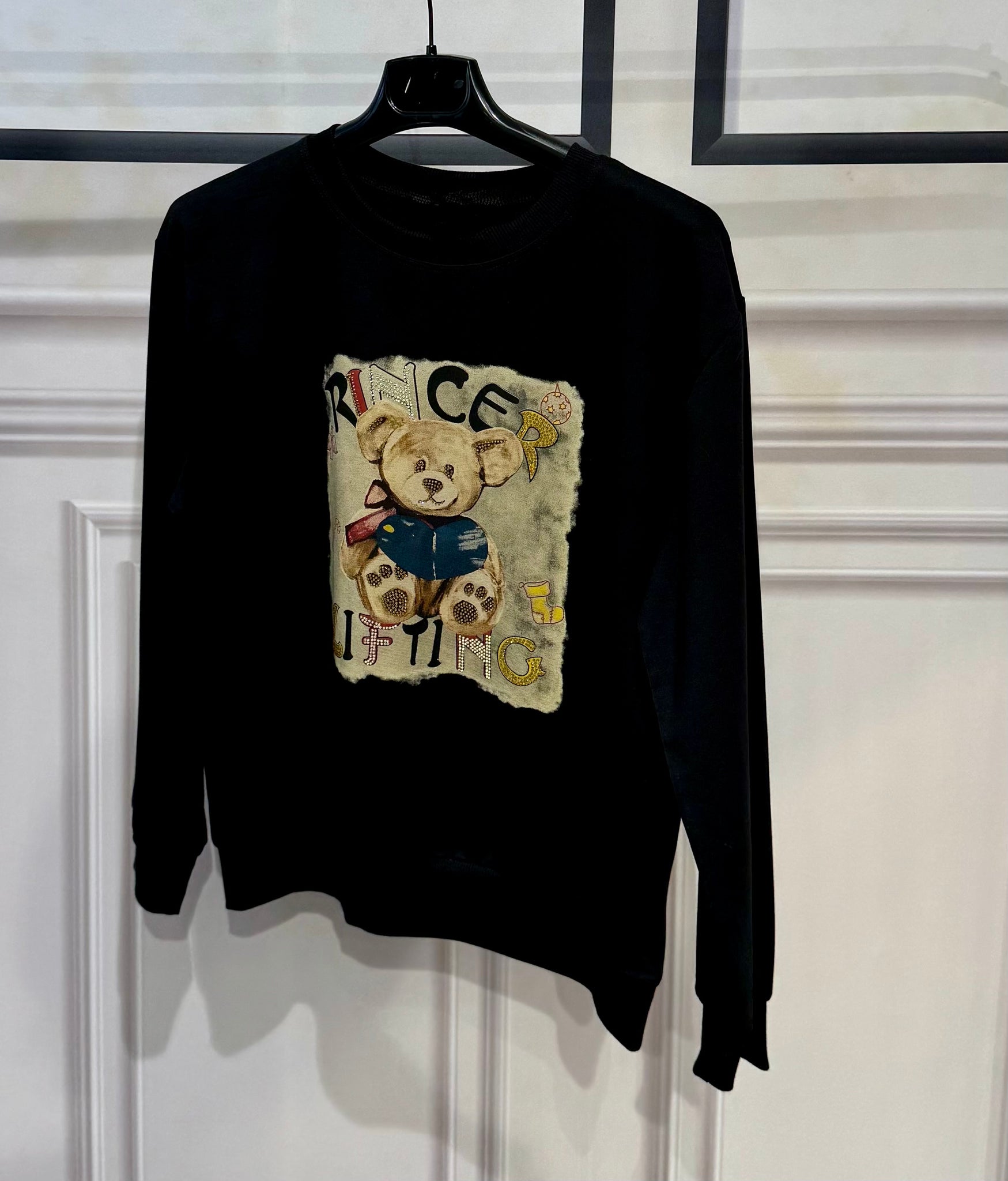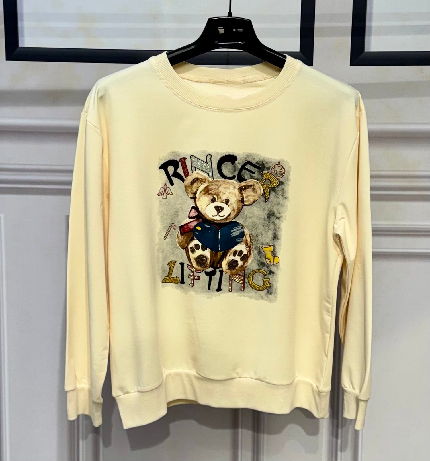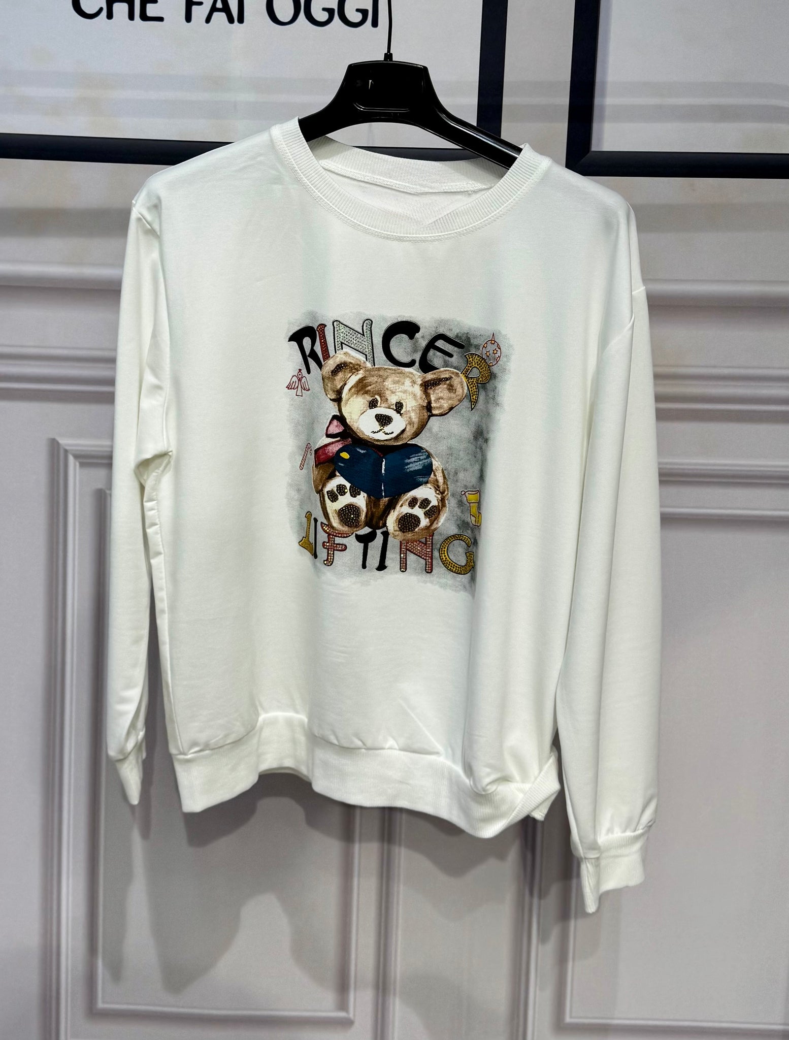 Felpa morbida e confortevole con stampa di orsetto sul davanti, impreziosita da strass a rilievo che donano luce e un delicato effetto 3D. Perfetta per un look casual con un tocco brillante. Vestibilità da 108cm a 134 di giroseno