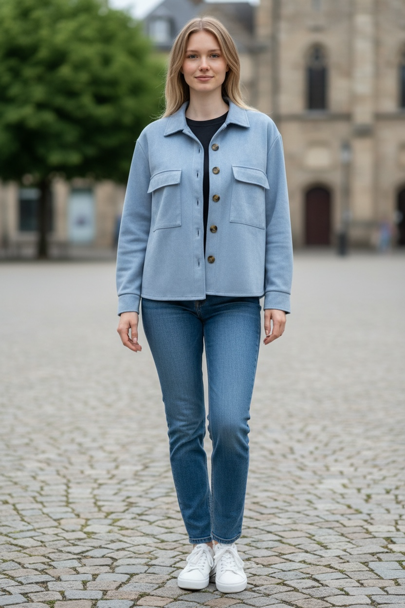 Giacca effetto camoscio dal look morbido e sofisticato.I finti tasconi frontali aggiungono stile senza rinunciare alla versatilità.Perfetta con jeans o pantaloni per un outfit casual chic. Vestibilità da 110cm a 126cm di giroseno