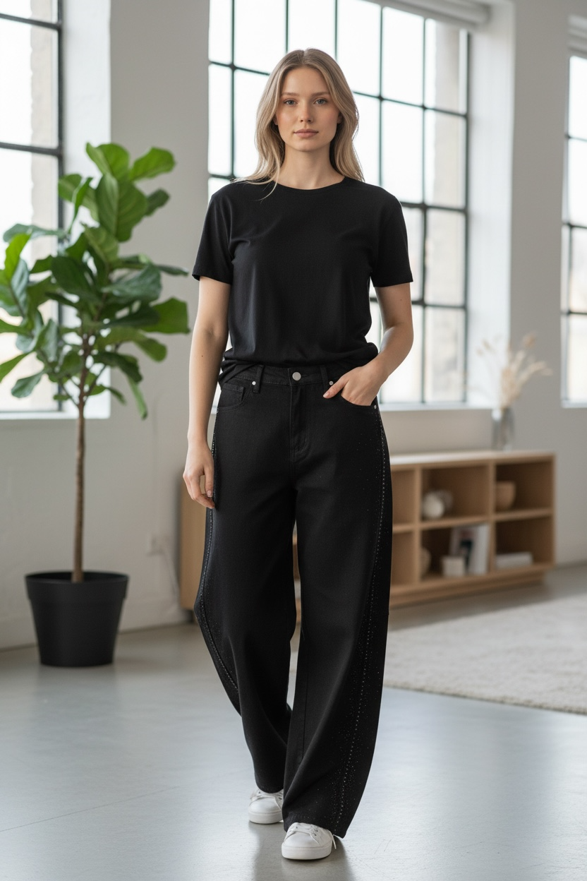 Jeans elasticizzati a gamba larga e vita alta, con strass decorativi. Comodi, stilosi e versatili, perfetti per un look casual-chic. Vestibilitá da 80cm a 100cm di girovita, 112cm a 128cm di girofianchi