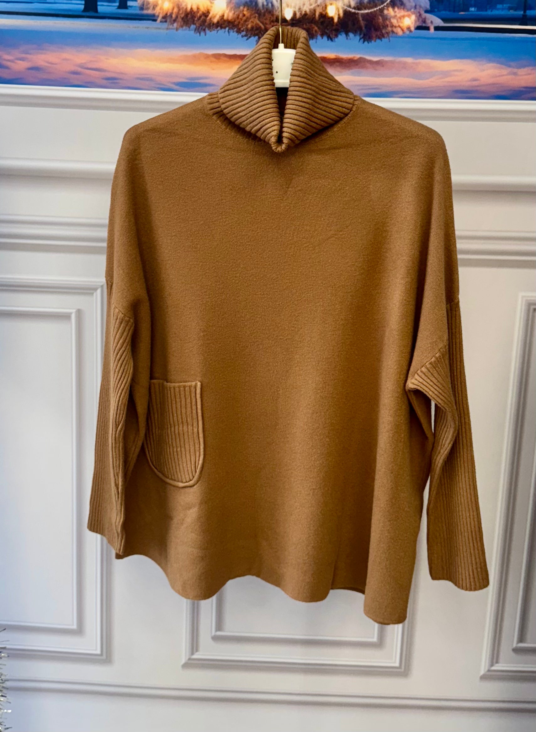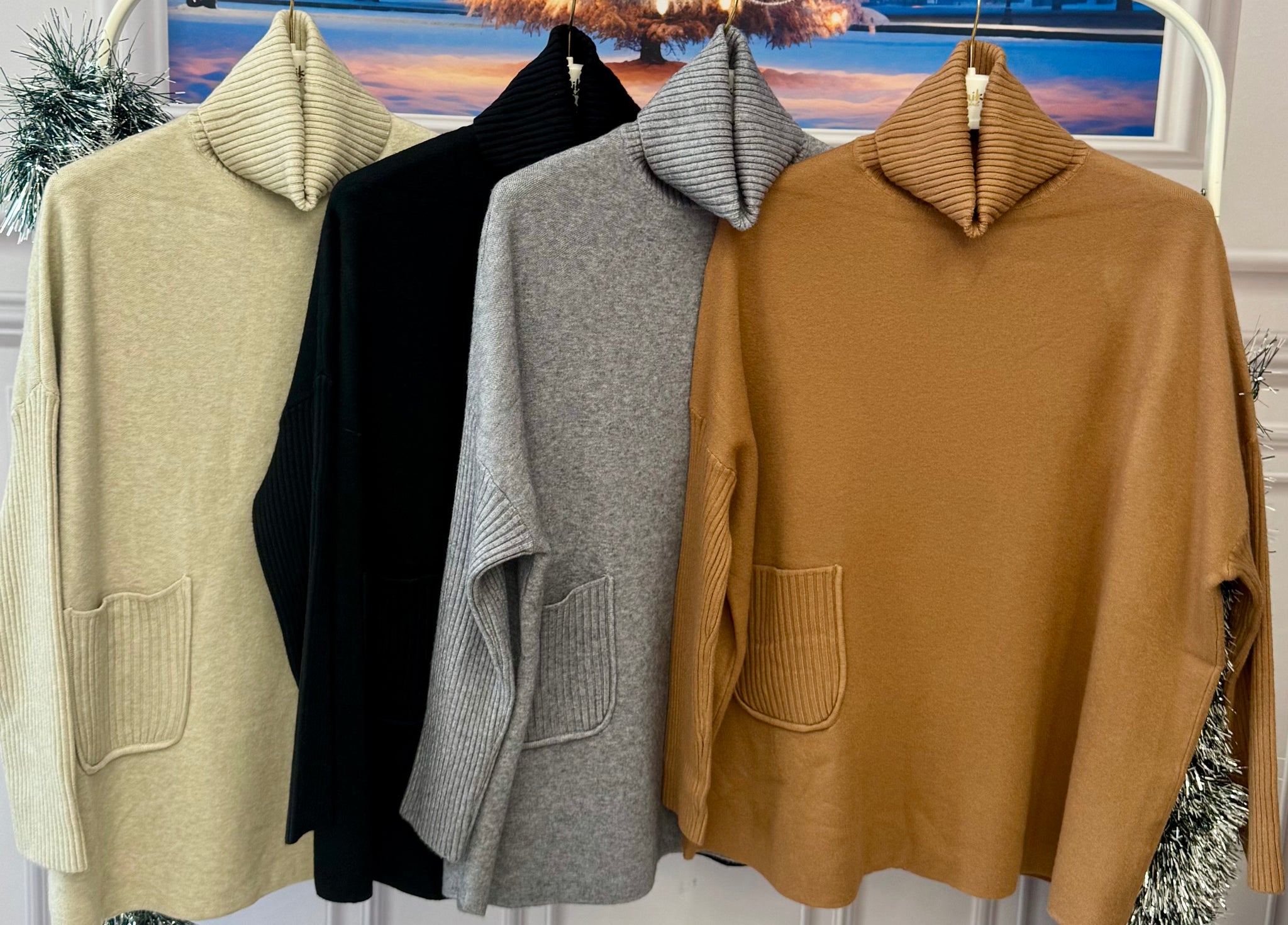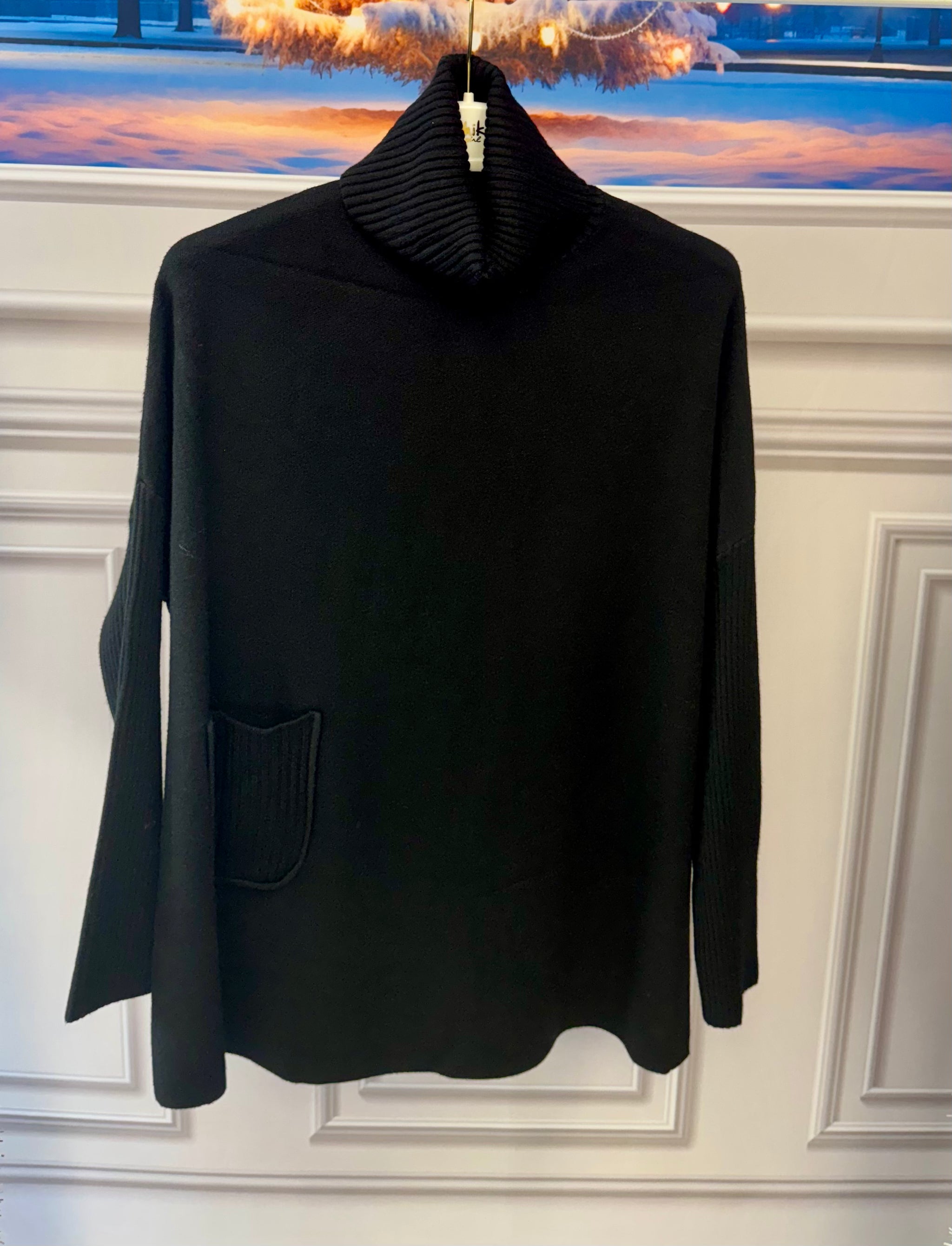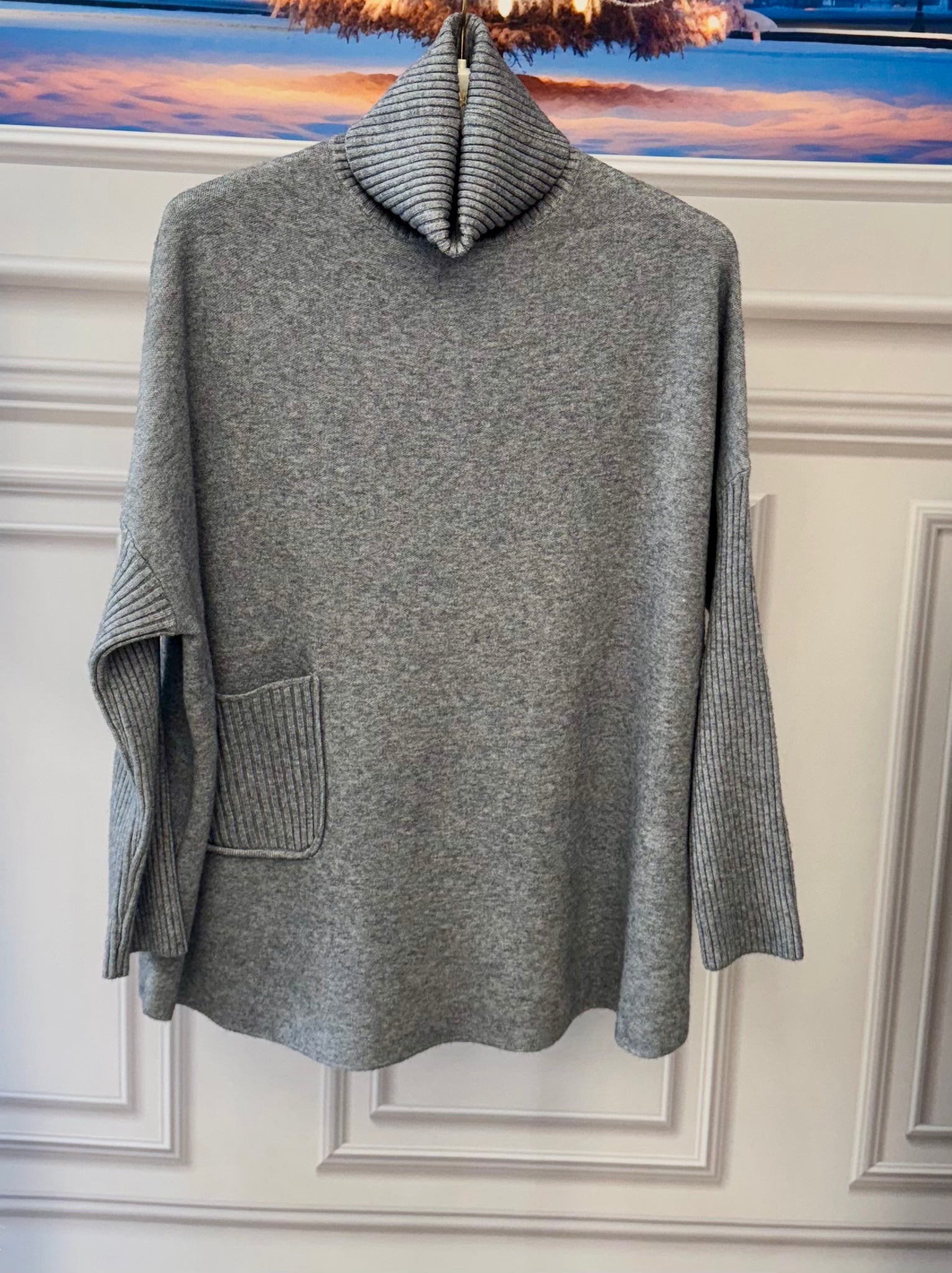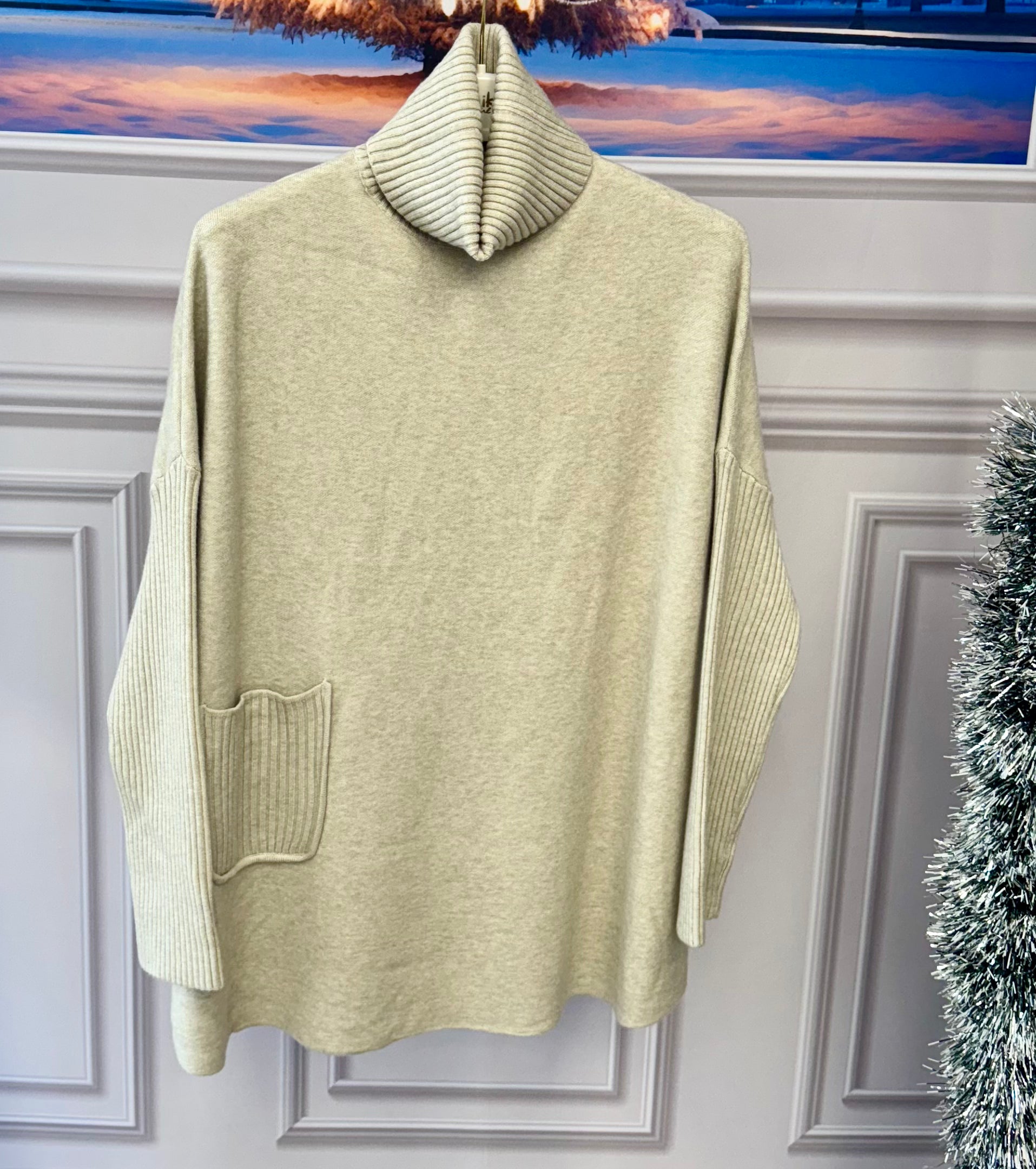 Maglioncino oversize in lana con collo altro e morbido, taschino a costine e manica e costine
