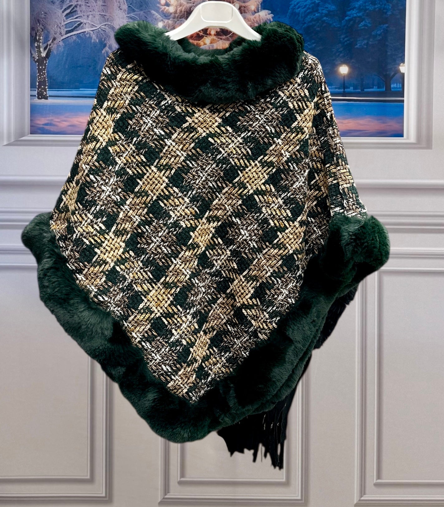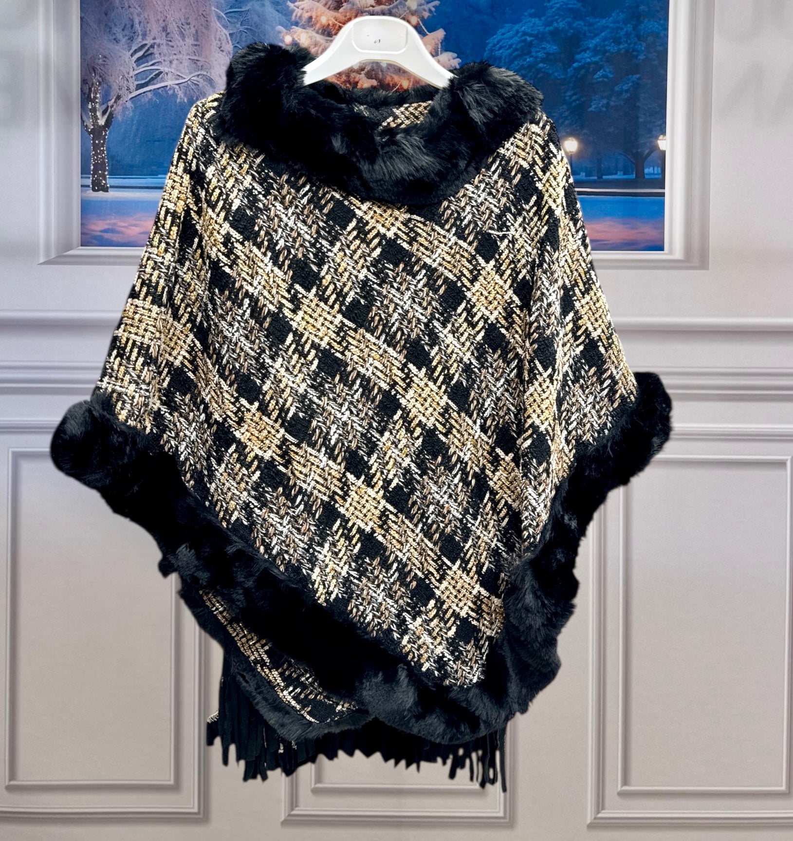 Mantella chiusa in tweed con filo lame e inserti in eco pelliccia
