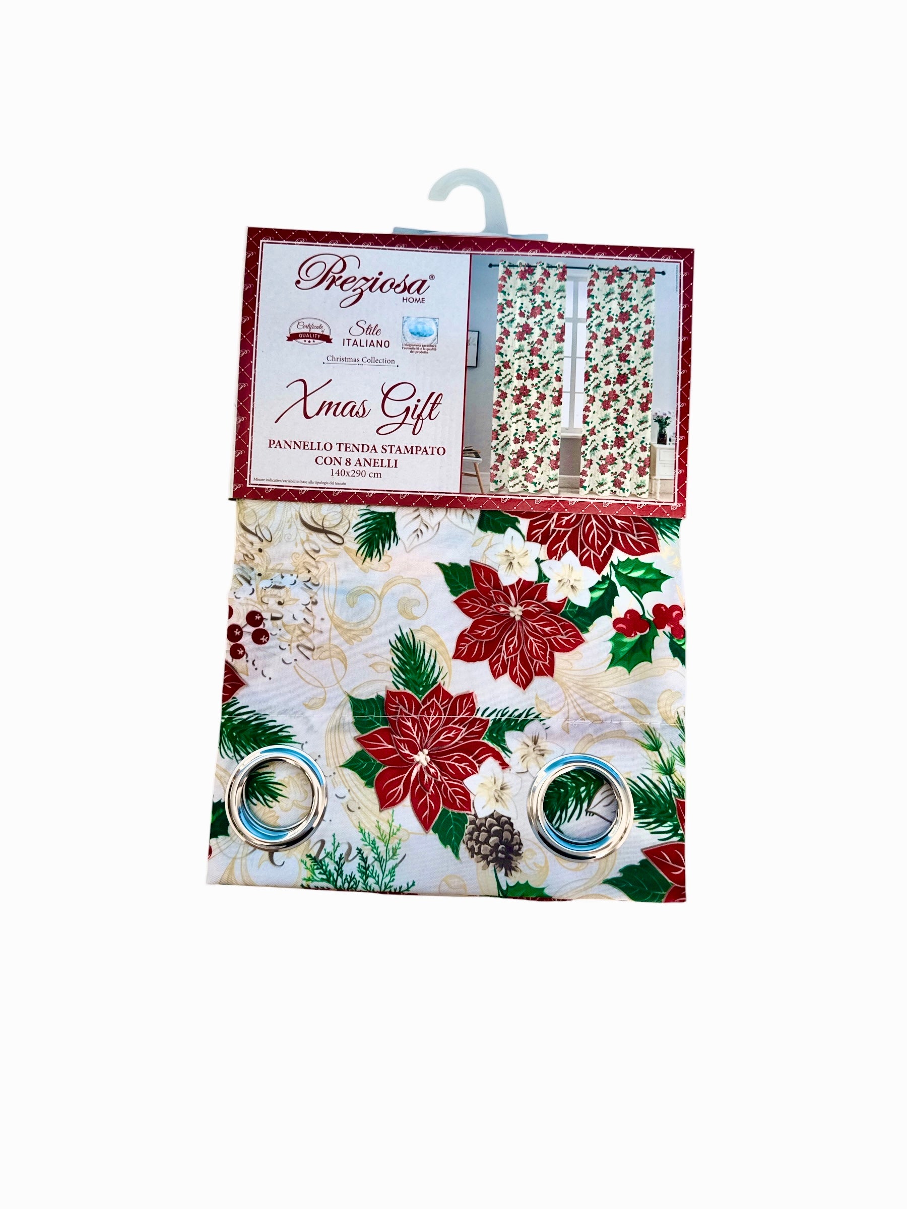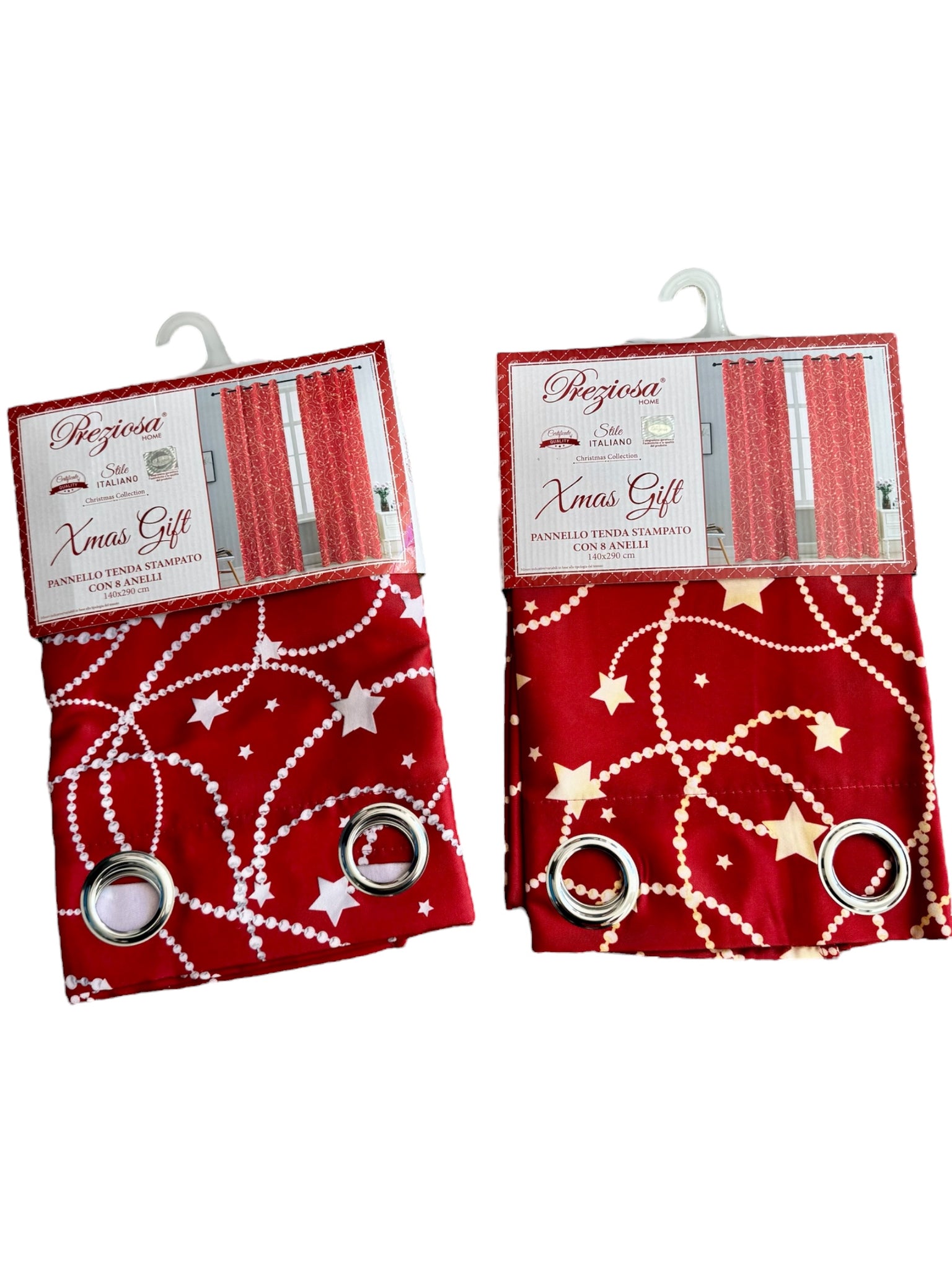 Pannello tenda natalizio con anelli, fondo rosso con fantasia stelle tra argento e oro