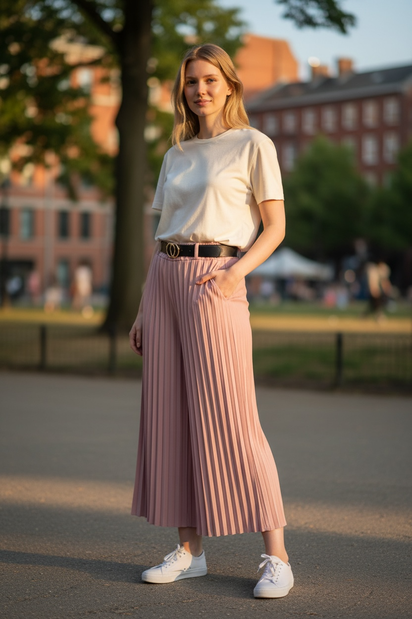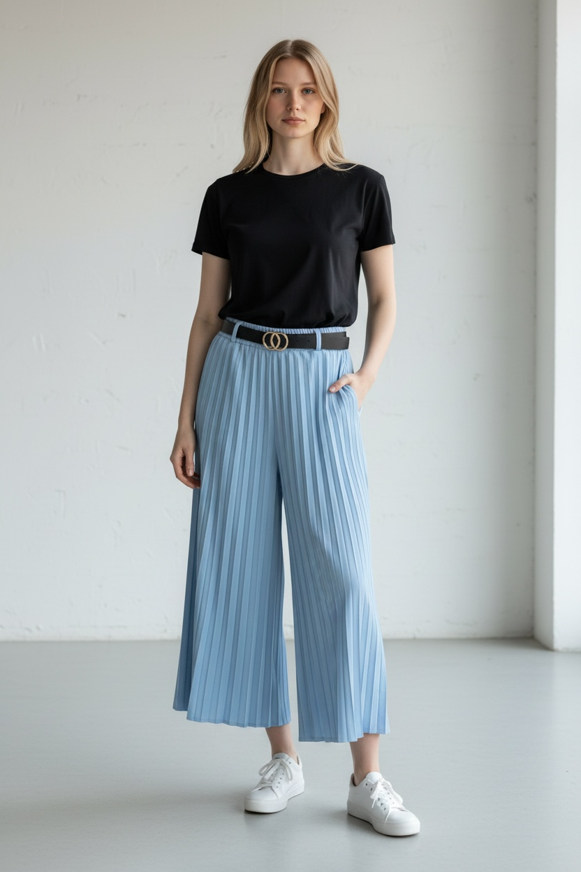 Pantaloni plissé a palazzo con vita elastica e cintura inclusa. Gamba ampia e fluida per un look elegante e confortevole, perfetti da abbinare a top aderenti o t-shirt casual.